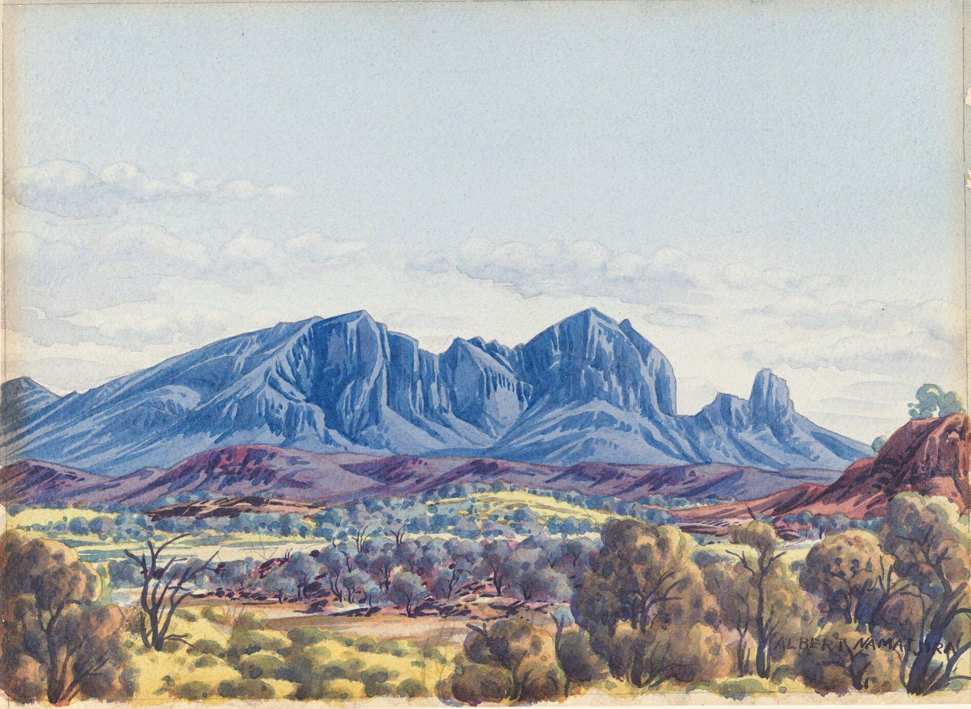 Born Elea Namatjira at the Hermannsburg Lutheran Mission, he was raised in the Western Aranda tradition but also educated in the mission school. His artistic journey began in earnest in 1934 when he met Australian artist Rex Battarbee. Namatjira acted as Battarbee’s guide in exchange for lessons in the use of watercolors. He proved to be a natural prodigy, mastering the medium with a unique sensitivity to the light, colors, and geological features of the desert that many non-Indigenous artists struggled to capture.