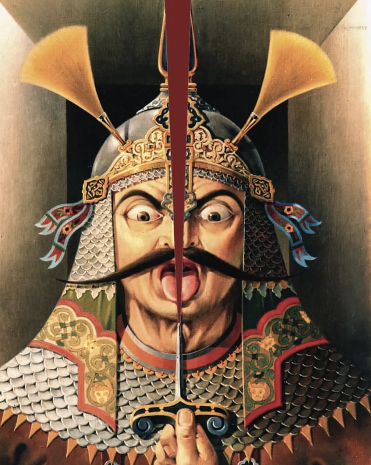 Sadeghi’s paintings often feature warriors from the Shahnameh (Book of Kings), mythical creatures, and intricate battle scenes, but he subverts these traditional themes with surrealist twists. He is famous for his “nail” motif (soldiers appearing as pins) and his “chairs” series, where he explores themes of power, war, and human identity. His work often oscillates between a playful, fairytale-like wonder and a somber, philosophical critique of human conflict.