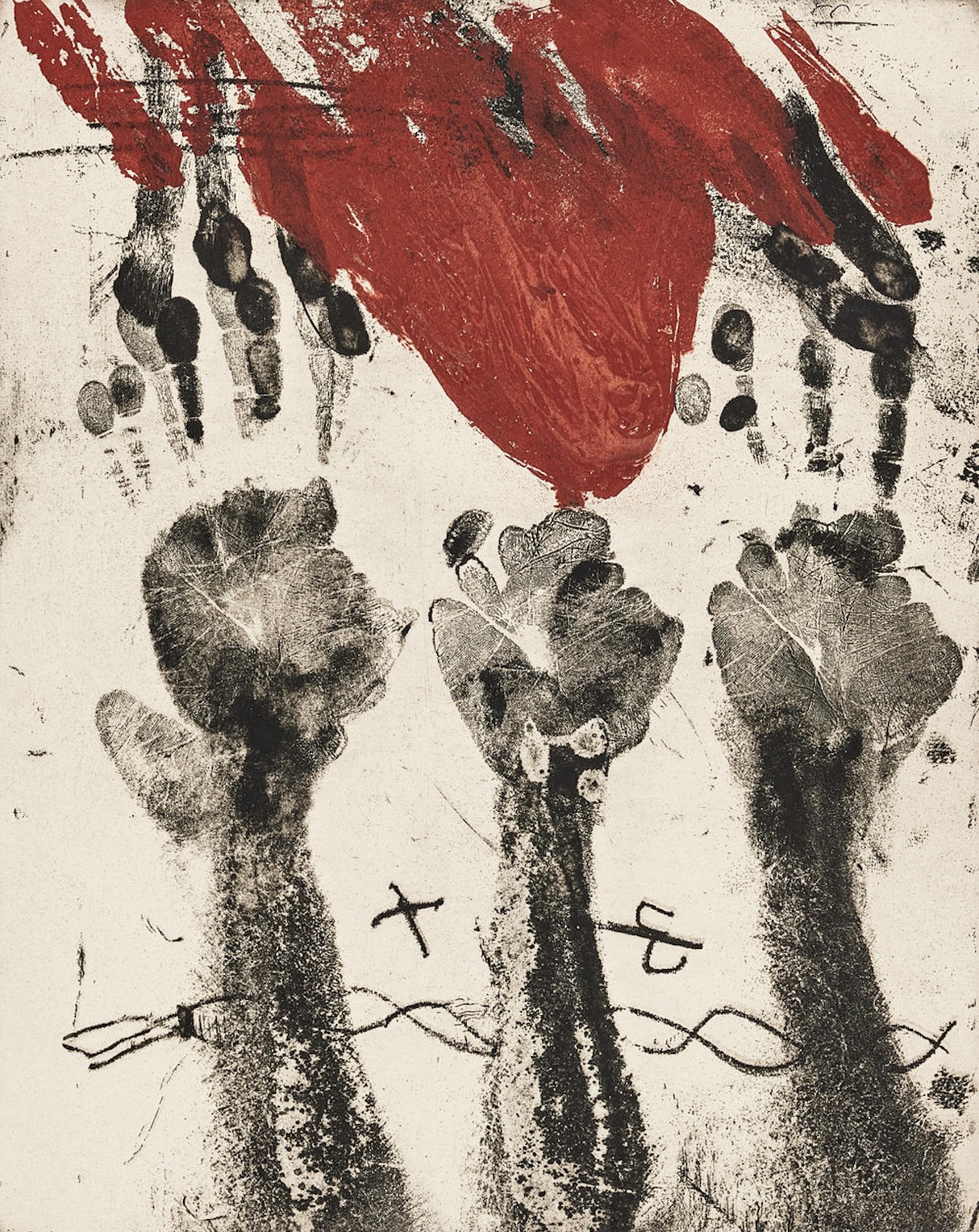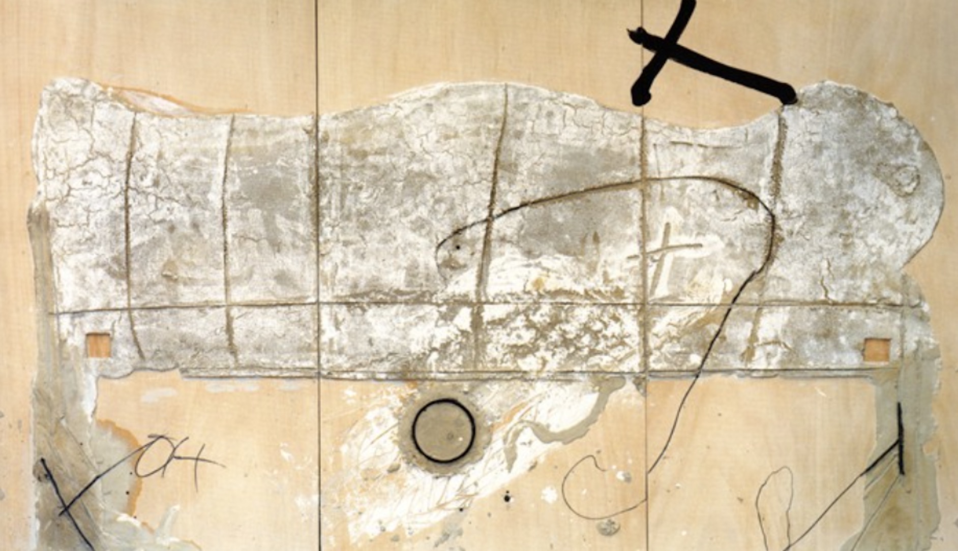 He began mixing non-traditional materials—such as crushed marble, sand, dirt, string, and ground chalk—into his oil paints, creating thick, impasto surfaces that resembled ancient, weathered walls. Upon these rough, earthy planes, he would scratch, gouge, and incise geometric shapes, graffiti-like marks, and cryptic symbols, most notably crosses, the letter “T” (for his name), and the letter “A” (for his wife, Teresa).