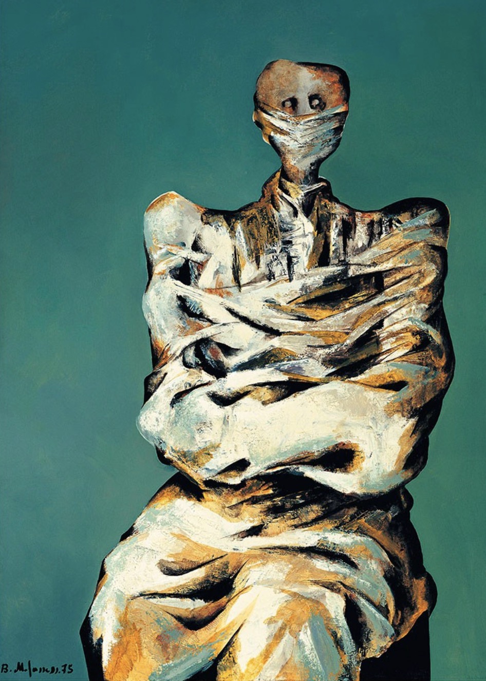 His visual language is instantly recognizable: heavily textured, distorted figures—often Minotaurs, anthropomorphic birds, and faceless, muscular forms. These figures convey a profound sense of isolation, despair, and defiance, standing in stark contrast to the nostalgic or traditional art prevailing in Iran at the time. His masterpiece, Fifi Howls from Happiness, is emblematic of this raw, visceral style.