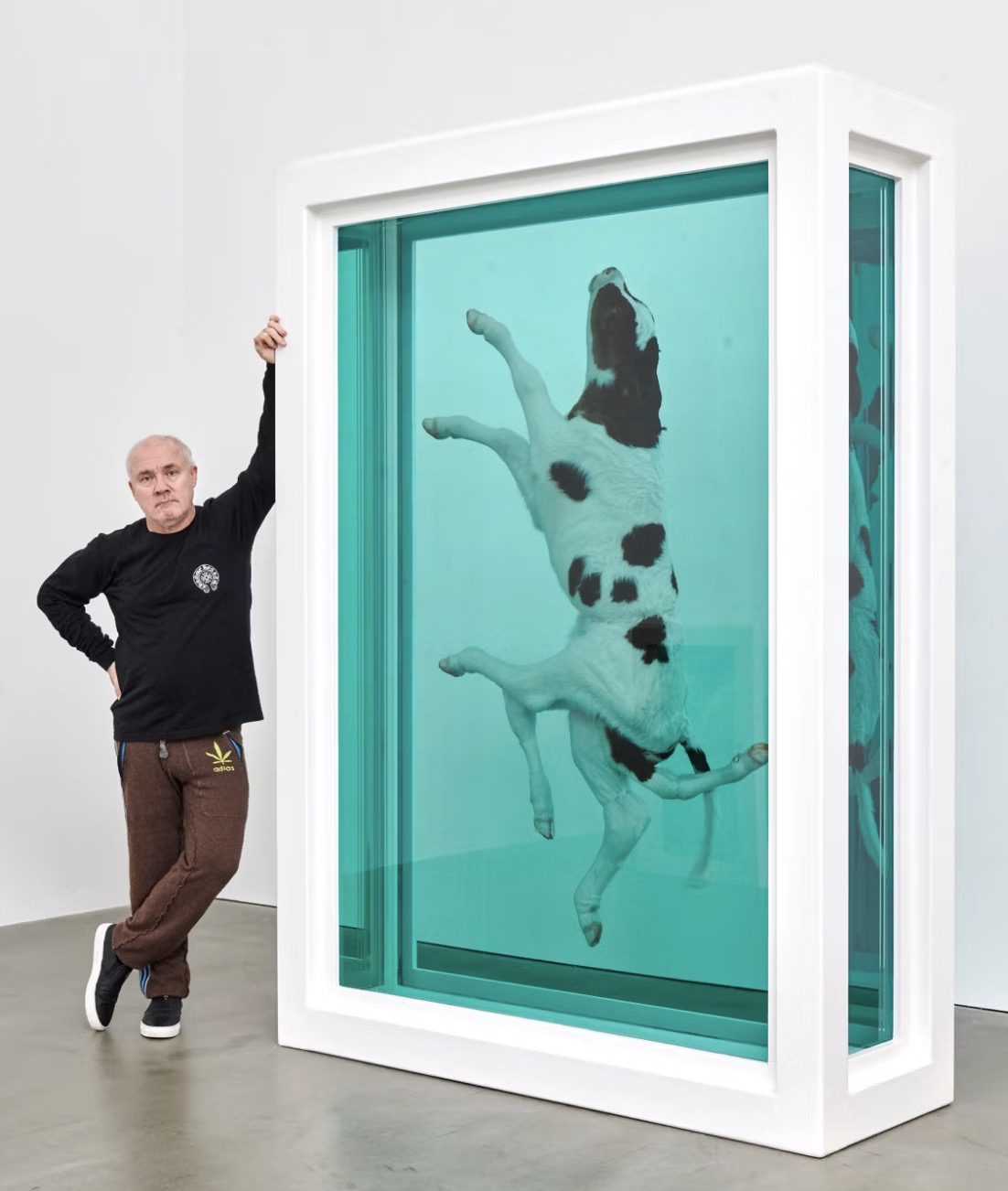 Hirst’s art frequently explores the complex relationships between art, religion, science, life, and death. He is most famous for his Natural History series, in which dead animals—including sharks, sheep, and cows—are preserved and displayed in clear tanks filled with formaldehyde. The most iconic of these is The Physical Impossibility of Death in the Mind of Someone Living (1991), a 14-foot tiger shark suspended in a vitrine, which became a defining symbol of Britart worldwide.