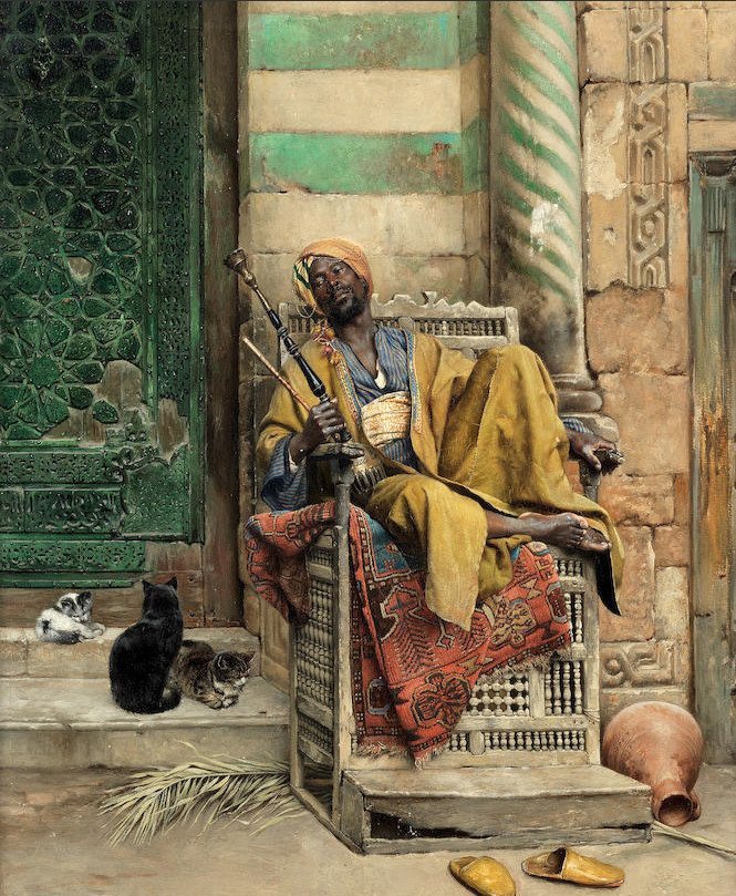 Though his earliest Orientalist subjects appeared in 1881, Deutsch’s first documented journeys to the Middle East were made in 1885, 1890, and 1898, when he visited Egypt. Throughout the 1890s, he visited Egypt at least three times. Like many of his contemporaries, he found inspiration in the North African light, colours, scenery and customs. He collected a vast quantity of Oriental objects, including tiles, furniture, arms, pipes, fabrics, and costumes which he would subsequently use in his paintings.[7]