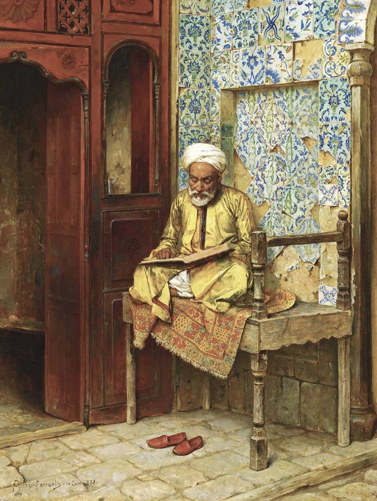 In addition, his Orientalist paintings were regularly shown at the Salon throughout the late 1880s and early 1890s. A brief list includes: Narghile Smokers (1887), At the El Azhar Mosque, Cairo (1889), Visit of the Great Sheikh to the University of Cairo (1890), A Descendant of the Prophet (1891) and Bedouin at the Arms Dealer (1893). Von Ferraris also won honorable mentions at both of the world fairs, the Exposition Universelle, in Paris in 1889 and 1900. At these international events, he exhibited his work with the Hungarian Section of artists rather than the French group, an indication that he was about to start moving once again.