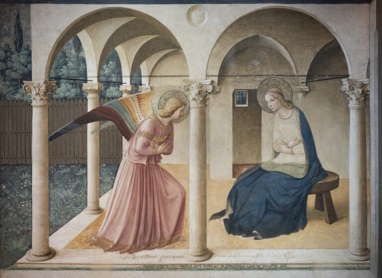 His most significant legacy is the series of frescoes painted for the Convent of San Marco in Florence (c. 1440–1445). Unlike the grand, crowded narratives of his contemporaries, these frescoes were designed for meditation. They are characterized by humble figures, serene expressions, and a distinctive use of clear, radiant colors—particularly blues and pinks—that seem to glow with divine light. The Annunciation at San Marco is widely considered a masterpiece of spiritual focus and spatial restraint.