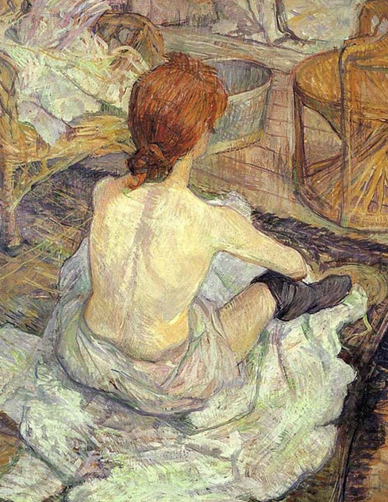 Born into the aristocracy, Toulouse-Lautrec broke both his legs around the time of his adolescence and, due to an unknown medical condition, was very short as an adult due to his undersized legs. In addition to his alcoholism, he developed an affinity for brothels and prostitutes that directed the subject matter for many of his works.