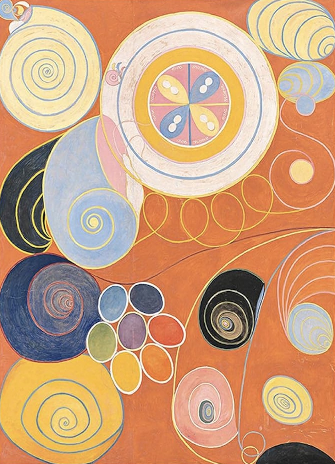 In 1896, she formed a spiritualist group called “The Five” (De Fem) with four other women. During their séances, she acted as a medium, receiving messages and visions from spiritual guides they called the “High Masters.” In 1906, at the age of 44, she began her most significant project: The Paintings for the Temple. Comprising 193 monumental paintings created between 1906 and 1915, this series was intended to be installed in a spiral temple to help viewers achieve spiritual enlightenment. Her aesthetic shifted entirely to complex, vibrant geometric forms, biomorphic shapes, and mysterious symbolic text.