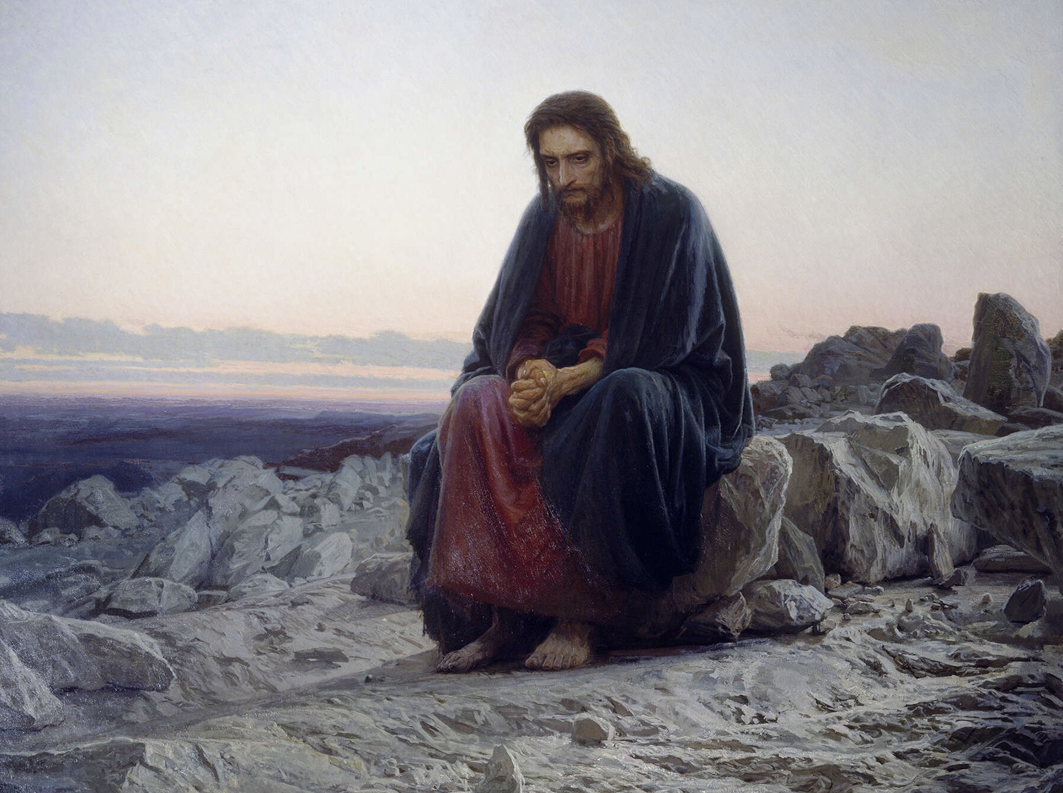 In one of Kramskoi’s most well known paintings, Christ in the Desert (1872, Tretyakov gallery), he continued Alexander Ivanov‘s humanistic tradition by treating a religious subject in moral–philosophical terms. He imbued his image of Christ with dramatic experiences in a deeply psychological and vital interpretation, evoking the idea of his heroic self-sacrifice.