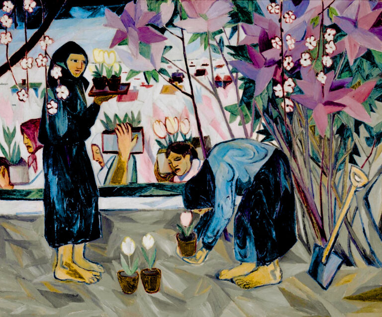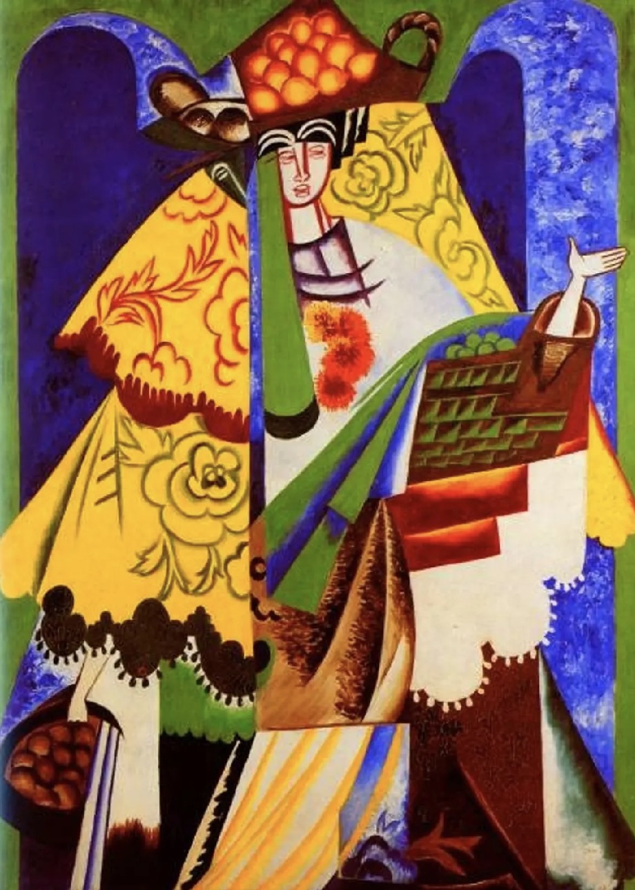 Goncharova began her studies at the Moscow School of Painting, Sculpture, and Architecture, where she met her lifelong companion, Mikhail Larionov. Together, they led several radical art groups, including the “Jack of Diamonds” (1910) and the “Donkey’s Tail” (1912). Her early style was a blend of Neo-Primitivism—inspired by Russian folk art (lubok) and religious icons—and the fragmented forms of French Cubism.