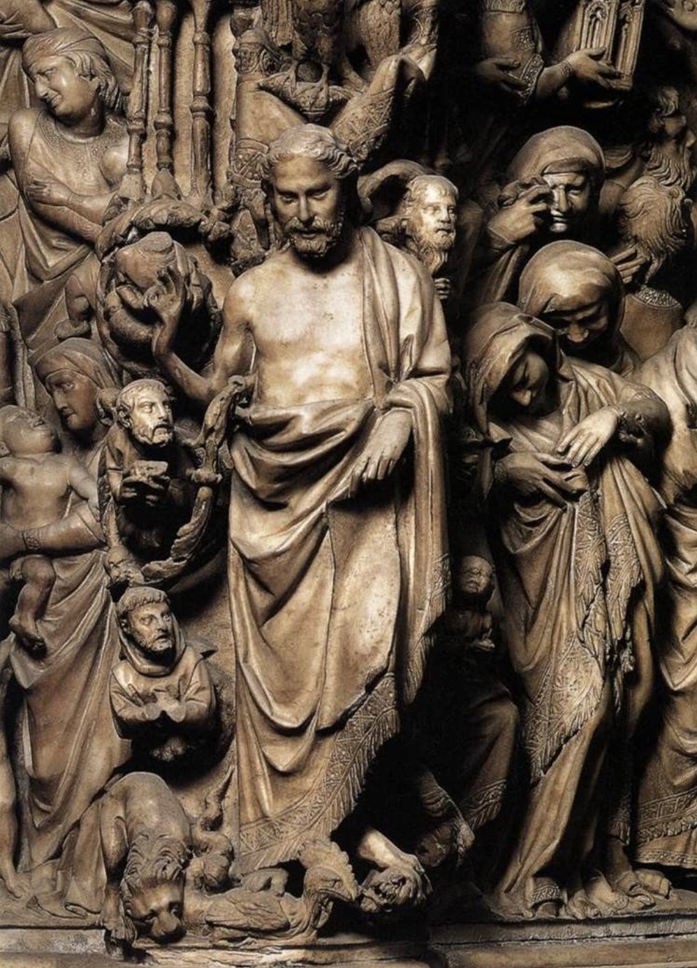 In 1265, he was commissioned to create a second major pulpit for the Siena Cathedral. This work was more ambitious and complex than the Pisa pulpit, featuring crowded, emotional scenes that moved closer to the French Gothic style. On this project, he led a workshop that included his son, Giovanni Pisano, and Arnolfo di Cambio, both of whom would become masters in their own right.