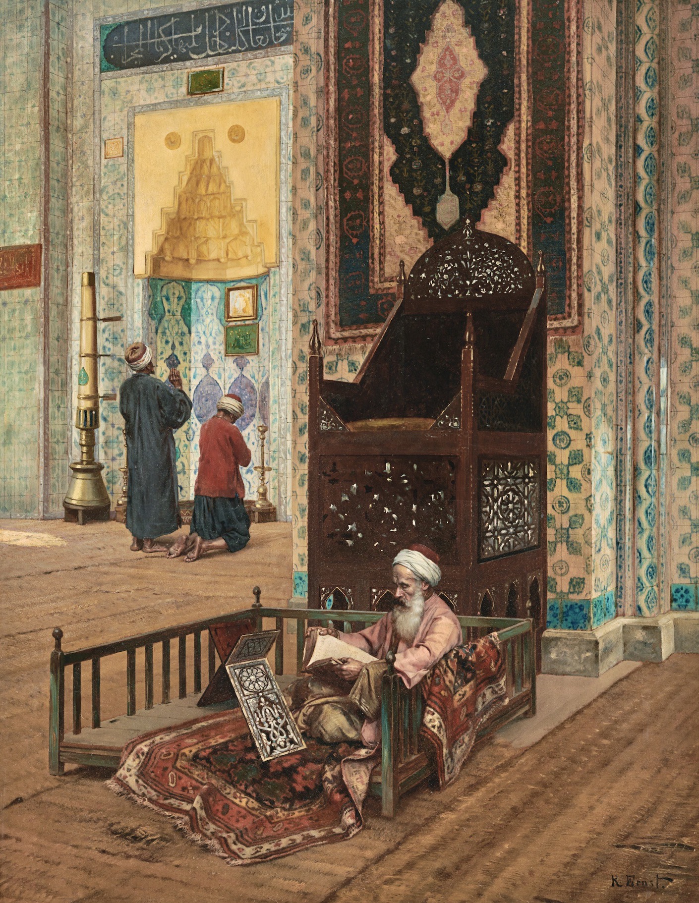 Ernst’s paintings often depicted palace guards, harem scenes, mosque interiors, and artisans at work. His style is characterized by a remarkable, almost photographic exactitude, rendering the complex geometric patterns of Ottoman tiles and the rich textures of silk and tiger skins with incredible precision. His mastery of light and intense color palettes made his work highly sought after by wealthy European and American collectors.